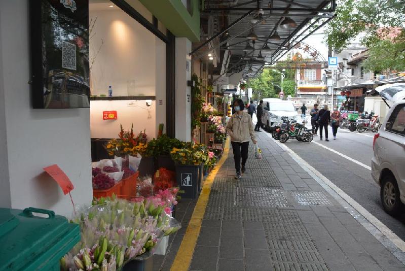 圖為2月8日記者拍攝的廈門溪岸路花鳥市場,黃色實線內(nèi)側(cè)為允許商家“適當(dāng)經(jīng)營外擺”的區(qū)域。新華社記者顏之宏 攝