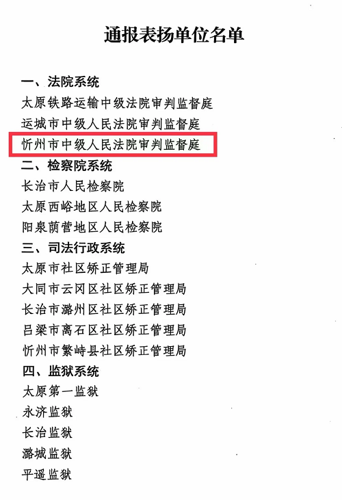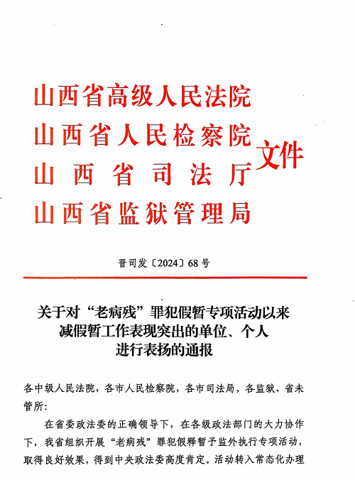 近日,山西省高級(jí)人民法院、山西省人民檢察院、山西省司法廳、山西省監(jiān)獄管理局印發(fā)《關(guān)于對(duì)“老病殘”罪犯假暫專(zhuān)項(xiàng)活動(dòng)以來(lái)減假暫工作表現(xiàn)突出的單位、個(gè)人進(jìn)行表?yè)P(yáng)的通報(bào)》,對(duì)減假暫工作表現(xiàn)突出的16家單位和25名個(gè)人予以通報(bào)表?yè)P(yáng),忻州中院審判監(jiān)督庭獲評(píng)“全省減假暫工作表現(xiàn)突出單位”。