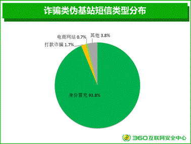 安全人員對(duì)詐騙類(lèi)偽基站短信內(nèi)容進(jìn)行篩選和分析發(fā)現(xiàn),身份冒充類(lèi)偽基站短信占到了絕大部分,占比為93.8%,打款詐騙(1.7%)、電商網(wǎng)站(0.7%)位列其后。