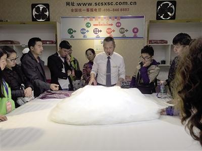 下午2點(diǎn)半,按照行程,旅行團(tuán)將參觀蜀繡,旅行團(tuán)被帶往一家門口寫有“蜀繡蜀錦科技文化展示中心”字樣的單位,但這家單位實(shí)際上是名為“依格爾”的床上用品直銷工廠。講解員簡單講解了有關(guān)蜀繡蜀錦的知識后,就把游客帶往一個展覽廳,向游客推介他們工廠的蠶絲床上用品,價格從3980到6980元不等。