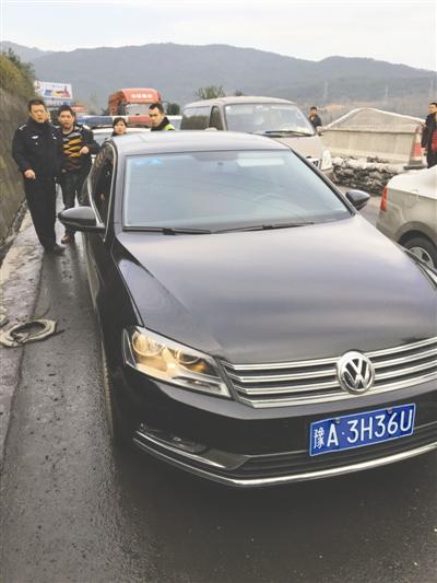 警方擋獲的嫌疑人挾持人質沖關的其中一輛黑色大眾轎車