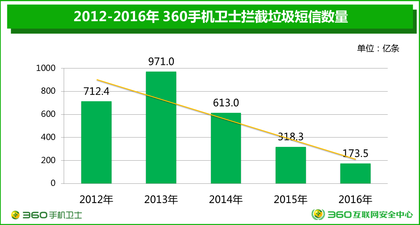 360手機(jī)衛(wèi)士日前發(fā)布的《2016年中國手機(jī)安全狀況報(bào)告》顯示,去年360手機(jī)衛(wèi)士共為全國用戶攔截各類垃圾短信約173.5億條,相較于2012年的700多億,降幅高達(dá)75.6%,五年來整體呈現(xiàn)快速下降的趨勢(shì)。