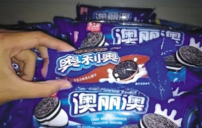 “粵利粵”、“粵利奧”、“奧利棒”……產(chǎn)品外包裝為清一色的藍色,包括產(chǎn)品構(gòu)圖方面都與正品“奧利奧”餅干極為相似。有的廣告詞都不改:“扭一扭、舔一舔、泡一泡”。
