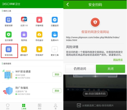 第五,使用360手機(jī)衛(wèi)士等安全管理軟件,通過安全掃碼功能掃描二維碼,識別釣魚網(wǎng)站以及手機(jī)木馬,保護(hù)手機(jī)安全不中招。