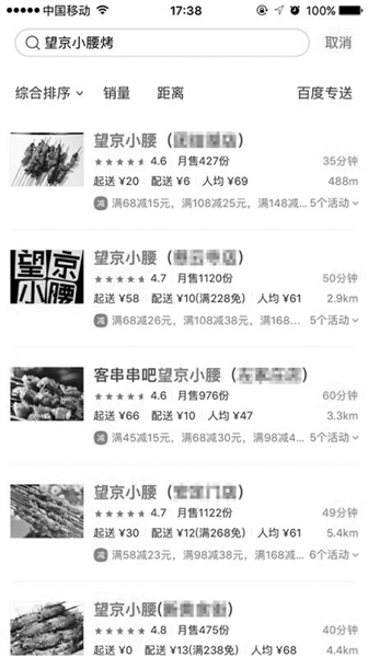 外賣平臺(tái)上多家“望京小腰”
