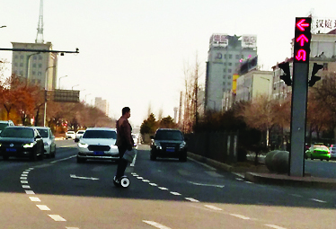 一男子騎助力車橫穿馬路,危險(xiǎn)!(王國(guó)棟 攝)
