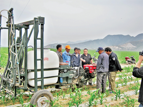在五臺縣茹村鄉(xiāng)農(nóng)機化示范區(qū),廠方技術(shù)員正在對農(nóng)機具操作手進行技術(shù)培訓(xùn),該示范區(qū)推廣應(yīng)用了中農(nóng)(北京)豐茂植保機械有限公司生產(chǎn)的3WX—400G 型自走式高稈作物噴稈噴霧植保機械,提升了玉米生產(chǎn)機械化程度。(鄭素平 攝)