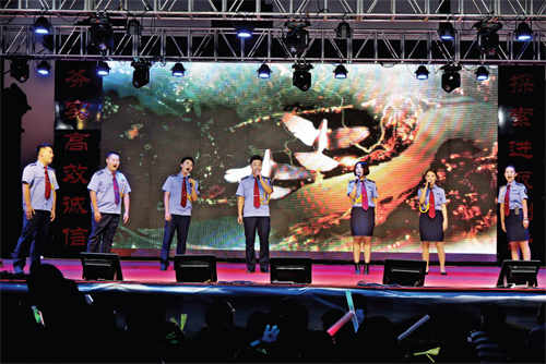 這場以“頌歌獻(xiàn)給黨,共圓中國夢”為主題的文藝晚會,是保安押運(yùn)人精心組織,自編、自導(dǎo)、自演的一臺節(jié)目,就像該公司黨委書記陳志平所說:“這場文藝晚會是我們保安押運(yùn)人向黨95歲華誕獻(xiàn)上的頌歌?!?月29日第一場晚會于晚8時(shí)正式上演,晚上7時(shí)便有觀眾陸續(xù)來到演出現(xiàn)場。第一場晚會就讓觀眾大呼過癮,節(jié)目形式多樣,有小合唱、獨(dú)唱、配樂詩朗誦、舞蹈、雙簧、小品、服裝秀等。其中舞蹈《映山紅》、男生獨(dú)唱《紅旗飄飄》、電聲樂隊(duì)《閃閃的紅星》歌曲串燒等用不同的藝術(shù)形式表現(xiàn)了保安押運(yùn)人對黨和祖國的熱愛之情,感染了現(xiàn)場的觀眾;而雙簧表演《文武雙全》將晚會現(xiàn)場氣氛推向高潮,兩位表演者夸張的表情、搞笑的扮相引得觀眾連連叫好。