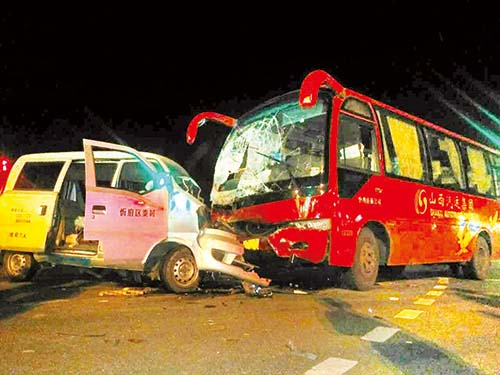 本報(bào)訊 7月10日22時(shí)20分左右,在忻州城區(qū)慕山橋北端的十字路口,一輛城際客運(yùn)汽車(chē)與一輛面包車(chē)相撞,客運(yùn)汽車(chē)前擋風(fēng)玻璃粉碎毀損,面包車(chē)前部嚴(yán)重變形,面包車(chē)上的傷者被隨后趕到的救護(hù)車(chē)送往醫(yī)院搶救,交警接警后也在第一時(shí)間趕赴現(xiàn)場(chǎng)調(diào)查事故原因、處理毀損車(chē)輛。