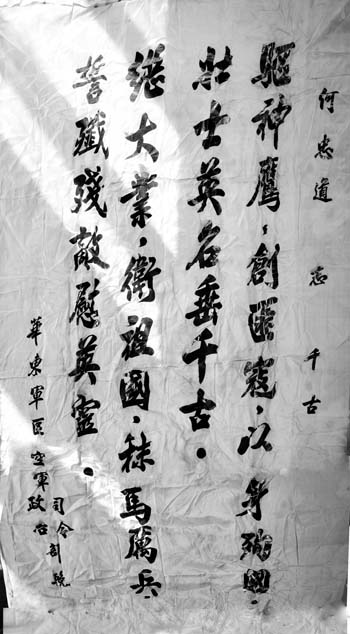 左為何忠道 何忠道,1933年3月生于河曲縣鋪溝村,祖父慶源為清末貢生,父親尚勤為耕讀文人。 1940年河曲解放,境內(nèi)建起了各級抗日民主政權,何忠道上了抗日根據(jù)地小學。1943年他的父親不但積極響應共產(chǎn)黨的減租減息號召,而且免除了貧困戶的全部地租。1944年其父病逝前為抗戰(zhàn)獻出千余畝土地。1945年,13歲的何忠道贊同兄長何佩道的意見,又說服母親獻出一部分土地。因其兄大他18歲,抗戰(zhàn)爆發(fā)前就參加了共產(chǎn)黨的外圍組織犧盟會宣傳抗日,父親病逝后,何忠道尊兄長為家長。 1946年內(nèi)戰(zhàn)爆發(fā),何忠道征得兄長同意,到50里外當時設在巡鎮(zhèn)一完小的晉綏二分區(qū)和獨立二旅辦的隨營學校報名學習。他從小就愛學習文化,到一完小后又學到了自己喜歡的軍事常識,在校期間成績名列前茅。 1947年春,河曲局勢緊張,從黃河西邊傳來國民黨占領延安的消息,相鄰河曲的陜北榆林地區(qū)布滿了國民黨軍隊。國民黨86師、蒙古軍黃文庭部沿黃河包圍了河曲,閻錫山朱五美部經(jīng)常過黃河襲擊河曲解放區(qū)。河曲境內(nèi)大旱,“一貫道”鼓動群眾要共產(chǎn)黨發(fā)放糧食,甚至要搶共產(chǎn)黨的糧站。河曲支前、征兵任務大,三月份剛送走一批新兵,第二批任務又下來了。值此關頭,當時15虛歲的何忠道,決心參加解放軍,投身解放戰(zhàn)爭。1947年5月,何忠道隨部隊到了晉中、臨汾一帶參加戰(zhàn)斗。 何忠道參軍半年后,家鄉(xiāng)河曲解放區(qū)全面展開了土地改革運動,同鄉(xiāng)戰(zhàn)士、干部互傳河曲的土改情況,由于對上級精神吃不透,沒能正確地執(zhí)行黨的土改政策,籠統(tǒng)地提出了群眾要怎辦就怎辦的口號,運動中發(fā)生了左的傾向,太注重清查地主的地財。何忠道聽到后,多次托負傷回鄉(xiāng)養(yǎng)病的同鄉(xiāng)帶信給母親、兄長,開導母、兄“不要埋怨群眾,只要家里有錢,就獻出來,支援解放戰(zhàn)爭,平分了土地,打敗國民黨反動派,大家都會過上好日子?!焙髞?,他讀了毛澤東《在晉綏干部會議上的講話》,看到晉綏的黨組織糾正偏差,他心里非常欣慰。 何忠道參軍后,先后歷任戰(zhàn)士、通訊員、偵察員、測繪員、見習偵察參謀。他積極向上,很快成為一名中國共產(chǎn)黨員。 1949年春,何忠道被空軍選拔到某航校培訓飛行員,成為人民空軍首批培訓的60名飛行員之一。在當學員期間,他刻苦鉆研理論,認真訓練飛行技術,離校時取得了優(yōu)良成績。 航校培訓結束后,何忠道被分配到空軍102部隊、1023部隊三大隊任飛行員,部隊駐上海,擔負著保衛(wèi)祖國領空和上海的重任。當時條件差,飛機少,飛行員少,沒有節(jié)假日,飛行員隨時在機場休息室等候戰(zhàn)斗任務。 1950年7月27日,美國總統(tǒng)杜魯門正式批準美國軍用飛機可到中國海岸進行偵察飛行后,該國的軍用飛機對山東半島、華東沿海和上海等地區(qū)頻繁進行偵察、襲擾活動。 1952年9月20日5時36分,駐上海地區(qū)防空警戒雷達兵部隊在上海東南133公里處發(fā)現(xiàn)1架美國B-29型轟炸機,高度1500米,直逼上海市。5時45分,空軍擔負該地區(qū)防空任務的第2殲擊航空兵師獲悉情報后,即令6團飛行員何忠道和李永年,分別駕駛米格-15型殲擊機升空作戰(zhàn)。在指揮所引導下,長機飛行員何忠道、僚機飛行員李永年飛至崇明島陳家鎮(zhèn)上空,距美機4公里時,美機首先開火射擊,何、李雙機急轉彎繞到美機尾后對其進行攻擊。從高度1500米一直打到200米,先后開炮4次,在長江口將入侵美機擊落,墜入海中。何忠道駕駛的飛機中彈一發(fā),雙機安全返航。這是空軍殲擊航空兵自1950年下半年開始獨立執(zhí)行國土防空作戰(zhàn)任務以來,擊落的第1架美國飛機,也是空戰(zhàn)取得的首次戰(zhàn)果。29日,空軍通報表彰第2師,并給何忠道、李永年各記大功一次。 1952年11月22日,美國空軍再次侵入我國領空,何忠道與本團飛行員楊木易駕機迎戰(zhàn),幾次拖住猖狂的美機,阻止其進入上海上空,何、楊雙機在上海外海擊落美軍PB4Y-2偵察機1架。何忠道所駕飛機也被敵軍自衛(wèi)隊擊落,何忠道英勇犧牲。 何忠道的犧牲,引起了整個空軍系統(tǒng)的震憾,人民空軍舉行了隆重的追悼大會??哲姍C關、華東軍區(qū)、生前所在部隊機關、戰(zhàn)友送了幾十幀挽幛??哲娝玖顔T劉亞樓、副司令員常乾坤、副政委吳法憲、參謀長王秉璋聯(lián)名敬獻的挽幛上書:“殲滅美國侵略者,堅決保衛(wèi)祖國領空,為何忠道同志復仇!”華東軍區(qū)司令部、政治部敬獻的挽幛上書:“驅神鷹,創(chuàng)飛寇,以身殉國,壯士英名垂千古。創(chuàng)大業(yè),衛(wèi)祖國,秣馬厲兵,誓殲殘敵慰英靈。” 1952年底,毛澤東主席為何忠道的兄長何佩道簽發(fā)了“革命犧牲軍人家屬光榮紀念證”,上刻印“永垂不朽”大字;空軍政治部給何佩道寄來了“革命軍人犧牲證明書”及家屬節(jié)哀安撫信;空軍司令部給河曲縣人民政府發(fā)去了嘉獎慰問信函。 空軍司令員劉亞樓在1953年“八一”建軍節(jié)講話中,特別提到了何忠道的名字。1957年8月1日,人民日報發(fā)表的劉亞樓將軍關于空軍發(fā)展壯大的建軍節(jié)慶典文章也提到何忠道及其英雄事跡:何忠道15歲參軍,犧牲時年僅20歲。生前實現(xiàn)了他作為一名共產(chǎn)黨員的愿望,立大功一次,二、三等功各一次,是空軍戰(zhàn)