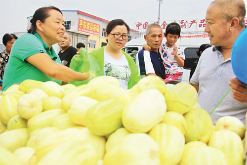 8月21日,原平市民老張正在該市農貿市場銷售香瓜,他的香瓜成了搶手貨,賣了個好價錢。他說,這樣的錯峰種植雖然利潤不小,但要做好計劃,合理利用土地,才能讓土地種植不減收。(吉建平 攝)