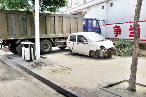 附近的居民們稱,人行道本來(lái)就不寬,這樣的“僵尸車”長(zhǎng)年累月停放在路邊不僅有礙觀瞻,而且對(duì)市民的出行造成了不小的影響。記者認(rèn)為,這些“僵尸車”如果廢棄不用的話,就該進(jìn)行報(bào)廢處理,而不是一直停放在路邊。希望車主能夠盡快現(xiàn)身對(duì)車輛進(jìn)行處理,同時(shí)也希望交警部門能夠加大監(jiān)管執(zhí)法力度,讓“僵尸車”的身影不再出現(xiàn)在街頭巷尾。圖為廢棄的汽車。(王君 攝)