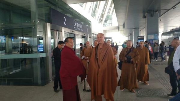 圖為五臺山望海寺住持釋覺一法師與弟子們順利到達(dá)西寧機(jī)場,木蘭加措法師前往迎接。 五臺山東臺頂望海寺住釋覺一法師攜眾弟子將代表中國五臺山法界出席此次活動(dòng)。抵達(dá)青海省西寧市后,釋覺一法師與泰國僧人、泰國文化部部長等國際友人共進(jìn)午餐并與眾僧人交流了兩國的佛教文化。