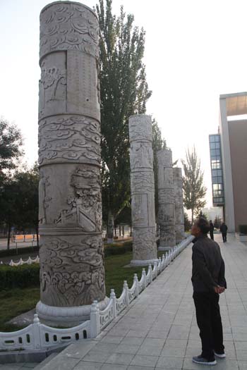 10月9日,原平市民在范亭文體廣場(chǎng)聚落的柱式雕塑前觀看愛國(guó)名將續(xù)范亭、東晉名士郝隆等16位名人紀(jì)念雕像。近年來(lái),該市著力打造文化強(qiáng)市,利用柱式雕塑像繪制歷史文化名人、抗日英雄等群體形象,營(yíng)造濃濃的文化氛圍。(褚震 攝)