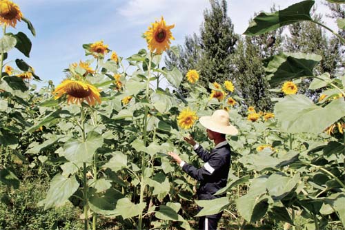原平市因地制宜,利用坡梁地發(fā)展葵花等小雜糧種植,并創(chuàng)新管護模式有效促進農民增收。圖為8月21日原平市解村鄉(xiāng)北崗村農民正在對向日葵進行田間管理。(趙春曉 攝)