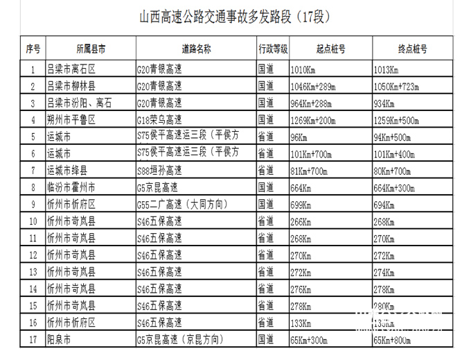 此次公布的68處道路事故多發(fā)點段,其中山西普通公路交通事故多發(fā)路段51段,山西高速公路交通事故多發(fā)路段17段。