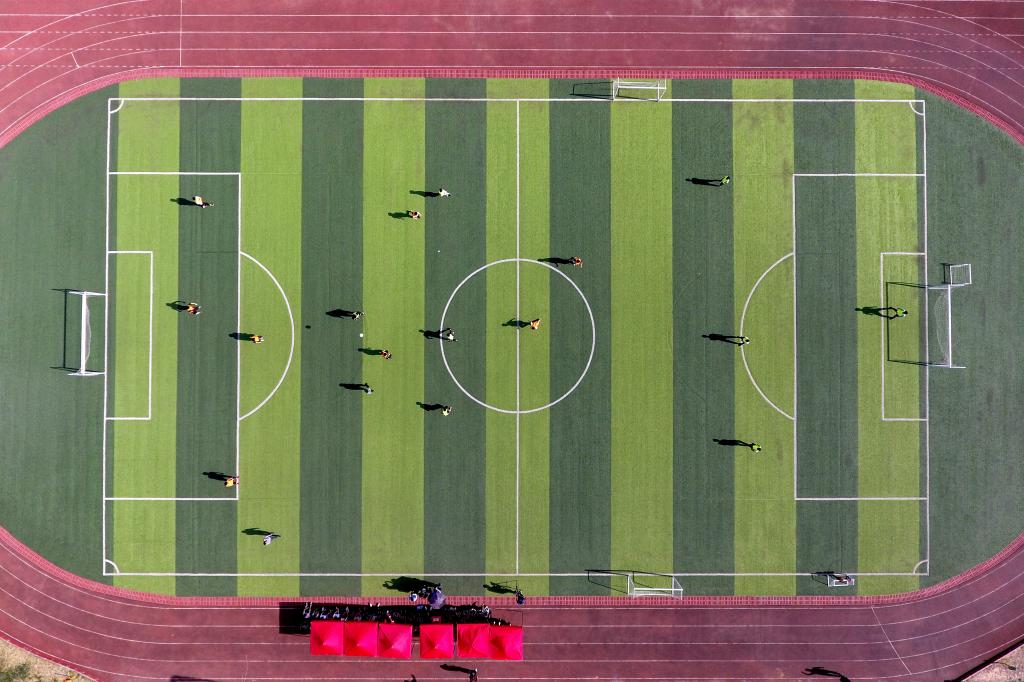 ↑這是初中組男子足球隊隊員們在進(jìn)行分組對抗賽(4月17日無人機(jī)拍攝)。新華社記者詹彥攝