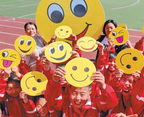 5月7日,各地學(xué)校舉辦豐富多彩的“微笑”主題活動,迎接5月8日世界微笑日的到來。圖為河北省秦皇島市河?xùn)|小學(xué)的學(xué)生在展示笑臉卡。