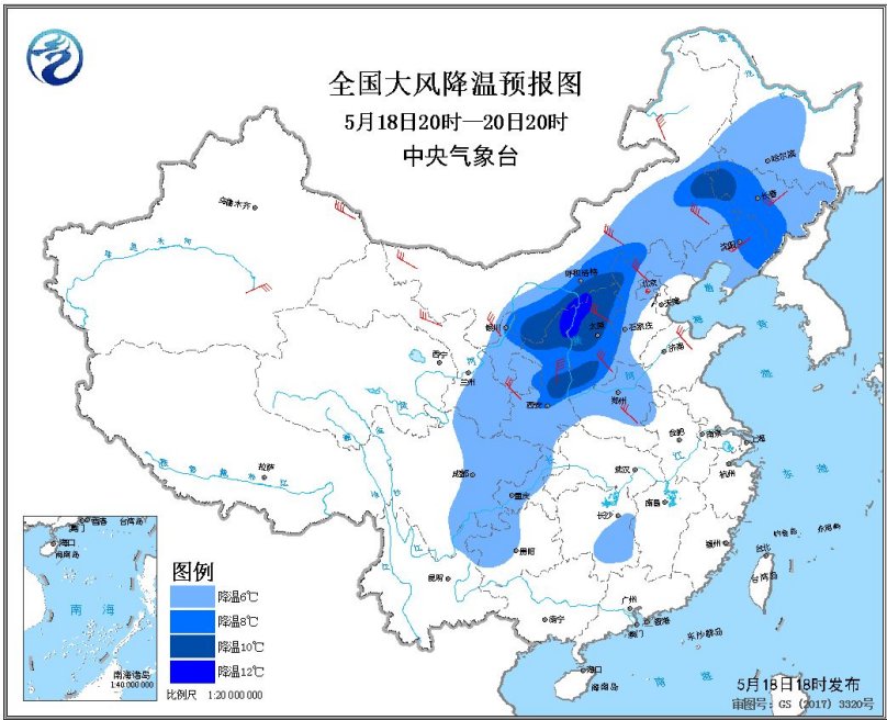 人民網(wǎng)北京5月18日電 據(jù)中央氣象臺(tái)網(wǎng)站消息,受南下冷空氣與西南暖濕氣流共同影響,18日夜間至20日,西南地區(qū)東部、江南大部、華南中北部等地自西向東將有中到大雨,局地暴雨或大暴雨。上述地區(qū)并伴有短時(shí)強(qiáng)降水、雷暴大風(fēng)等強(qiáng)對(duì)流天氣。 預(yù)計(jì),5月18日20時(shí)至20日20時(shí),西北地區(qū)大部、華北大部、東北地區(qū)、黃淮、新疆等地的部分地區(qū)有5~7級(jí)風(fēng),陣風(fēng)可達(dá)8~9級(jí),其中,內(nèi)蒙古中部和東部、山西北部、河北北部等地局地陣風(fēng)可達(dá)10級(jí)以上;東北地區(qū)大部、華北中東部、黃淮西部、西北地區(qū)東部、西南地區(qū)東部等地最低溫度或平均溫度將下降6~8℃,其中,內(nèi)蒙古中部偏南地區(qū)、陜西北部、山西北部、吉林西部等地的部分地區(qū)降溫10℃以上。中央氣象臺(tái)5月18日18時(shí)繼續(xù)發(fā)布大風(fēng)降溫預(yù)報(bào)。