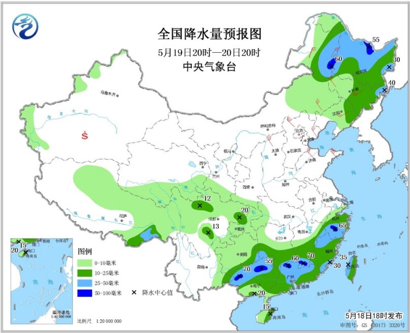 全國降水量預(yù)報(bào)圖(5月18日20時(shí)-19日20時(shí)) 5月19日20時(shí)至20日20時(shí),內(nèi)蒙古東北部、東北地區(qū)中北部、江南南部和東部、華南大部等地的部分地區(qū)有中到大雨,局地有暴雨(50~70毫米)。內(nèi)蒙古中東部、華北、黃淮、東北地區(qū)中南部等地的部分地區(qū)有4~6級(jí)風(fēng),陣風(fēng)7~8級(jí)。南疆盆地等地局地有揚(yáng)沙或浮塵。渤海西南部海域?qū)⒂?~8級(jí)、陣風(fēng)9~10級(jí)的西北風(fēng)。