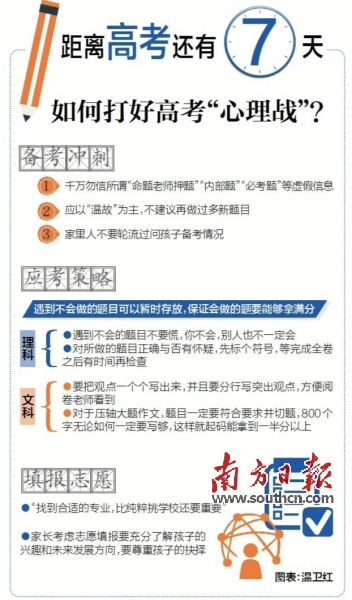 距離高考不足10天,張敏強(qiáng)認(rèn)為,此時(shí)探究學(xué)習(xí)方法、學(xué)習(xí)新知識(shí)已不現(xiàn)實(shí),也難以在短時(shí)間有明顯成效,關(guān)鍵是要做好考前心理調(diào)適以及掌握應(yīng)考技巧。張敏強(qiáng)不建議考生做新的題目,而是要把之前做過(guò)的題目鞏固記憶。他提醒考生,千萬(wàn)勿信所謂的“命題老師押題”等虛假信息,“命題人員的身份是絕密的,即便是命題老師也不會(huì)知道試卷上最終使用了哪一道題目?!?/p>