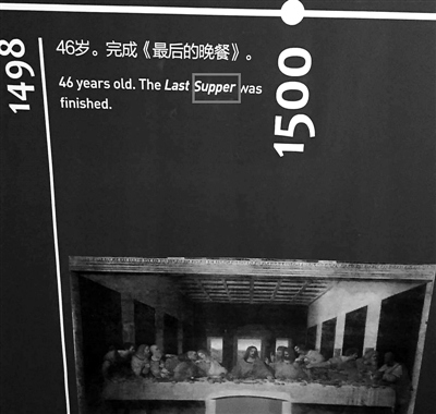 該網(wǎng)友發(fā)現(xiàn),在這個介紹達(dá)·芬奇生平的年表上,英文錯誤不止一處:關(guān)于達(dá)·芬奇46歲的經(jīng)歷,展覽介紹說:“46歲。完成《最后的晚餐》”,其對應(yīng)的英文翻譯是“46 years old. The Last super was finished.”而super一詞在英文中的意思是“超級的”,“晚餐”的英文詞匯實為supper,該翻譯中少了一個字母“p”。