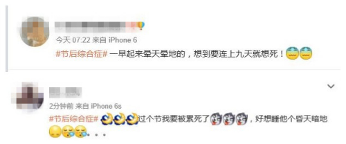 自2015年2月至今,新浪微博“#節(jié)后綜合癥#”的話題主頁(yè)持續(xù)有新帖發(fā)布,總閱讀量超過1000萬。節(jié)后第一天尚未到來,已經(jīng)有網(wǎng)友發(fā)帖抱怨“一早起來暈天暈地的”“好想睡他個(gè)昏天暗地”。