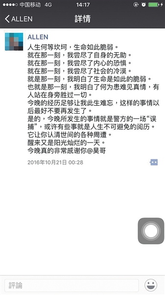 事后,被錯(cuò)抓的大學(xué)生黃誠(chéng)發(fā)朋友圈感慨“嘗盡恐懼”。
