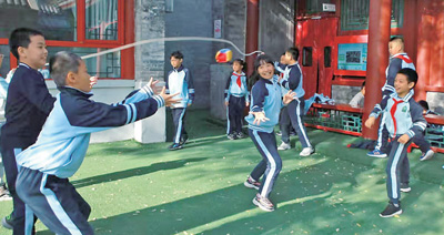北京市東城區(qū)黑芝麻胡同小學(xué)圓恩寺校區(qū)位于一條胡同里,空間略顯局促。學(xué)校發(fā)布了“課間活動征集令”,把課間15分鐘交給學(xué)生自己設(shè)計和策劃?!熬幓ɑ@3個人就能玩,不占地方”“可以觀察、養(yǎng)護池塘邊的植物”“華容道、九連環(huán)”……學(xué)生們紛紛為課間活動支招。