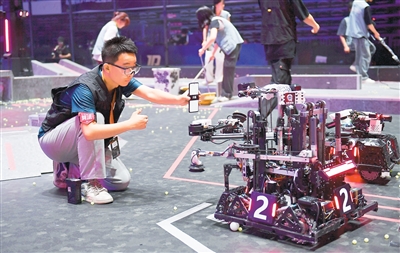 5月21日至5月25日,全國大學生機器人大賽——RoboMaster2025機甲大師超級對抗賽·區(qū)域賽(中部賽區(qū))在湖南省長沙市舉行。圖為合肥工業(yè)大學蒼穹戰(zhàn)隊隊員在比賽間隙調試機器人。新華社記者 陳振海攝