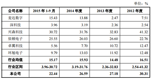 招股書顯示,易德龍負(fù)債水平偏高,流動負(fù)債占比超過95%,面臨較大的短期償債風(fēng)險。而除了償債風(fēng)險外,公司主營業(yè)務(wù)毛利率在報告期內(nèi)持續(xù)下降,2012年為30.31%,到2015年9月末已降至22.44%,而同時期內(nèi)行業(yè)銷售毛利率均值基本穩(wěn)定在27%左右。