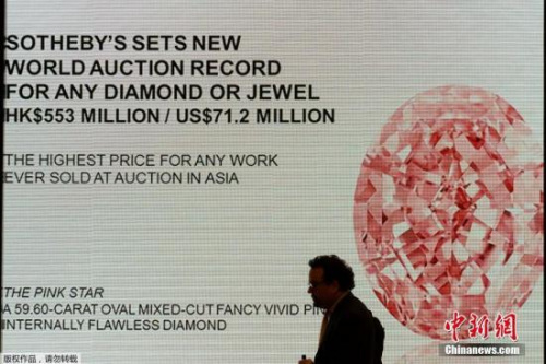 中新網(wǎng)4月5日電 據(jù)外媒報(bào)道,近日,重達(dá)59.60克拉、一顆被稱為“粉紅之星”的罕見鉆石在香港拍賣的價(jià)格超過(guò)了7100萬(wàn)美元,刷新了全球鉆石的拍賣紀(jì)錄。