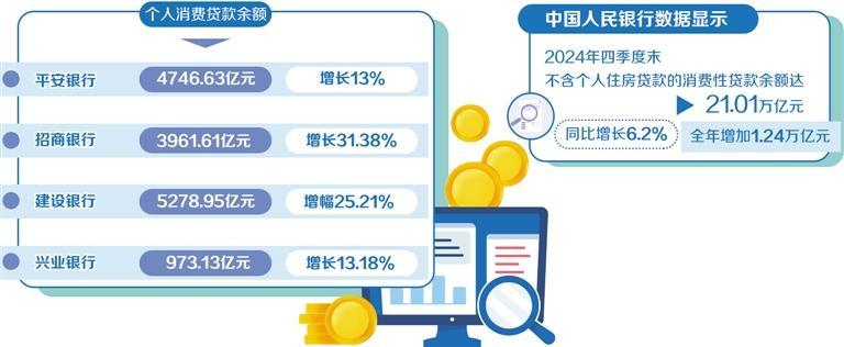 2024年,上市銀行零售業(yè)務(wù)普遍進入調(diào)整期,消費貸業(yè)務(wù)增長強勁。在擴內(nèi)需、促消費的背景下,消費貸成為零售業(yè)務(wù)的新增長點。中國人民銀行數(shù)據(jù)顯示,2024年四季度末,不含個人住房貸款的消費性貸款余額達21.01萬億元,同比增長6.2%,全年增加1.24萬億元。多家銀行在2024年年報中披露的個人消費貸款數(shù)據(jù)有明顯增長。其中,平安銀行個人消費貸款余額4746.63億元,同比增長13%;招商銀行個人消費貸款余額3961.61億元,較上年末增長31.38%;中國農(nóng)業(yè)銀行含信用卡在內(nèi)的個人消費貸款余額1.3萬億元,新增2943億元,增速28.3%;中國建設(shè)銀行境內(nèi)個人消費貸款余額5278.95億元,增幅25.21%;興業(yè)銀行個人消費貸款余額973.13億元,較上年末增長13.18%。南開大學(xué)金融學(xué)教授田利輝表示,隨著國家提振消費政策的出臺,銀行零售業(yè)務(wù)有望逐步提速。消費貸業(yè)務(wù)有望在政策支持下繼續(xù)增長,成為銀行重要的利潤來源。