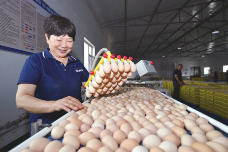將檢驗合格的雞蛋平穩(wěn)裝車運往周邊超市。