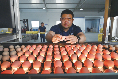 雞蛋通過自動分級機流向預先設定規(guī)格標準的生產線,工作人員再將大小一致的雞蛋收集碼盤。