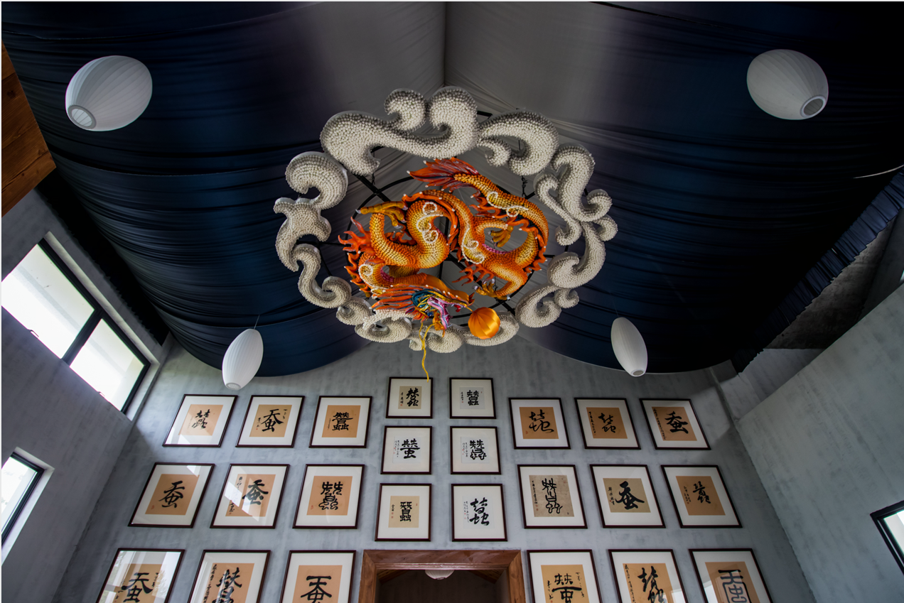 走入云龍村的云龍記憶館,縱使見多識廣,全國主流媒體記者們也依然被盤旋于頂的碩大金龍震撼到了,紛紛掏出手機拍個不停:這條金龍是用15000多個蠶繭制作而成,外圍是蠶繭組成的祥云,包裹著里面的金龍,這是云龍村的象征。
