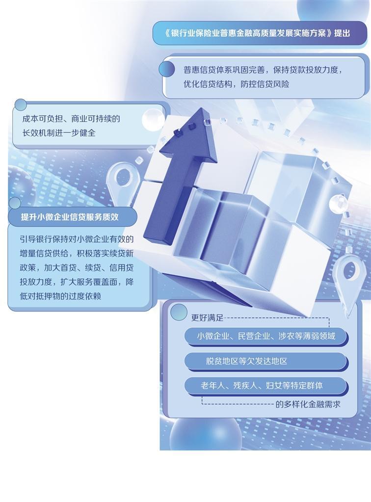 近年來,我國普惠金融發(fā)展取得長足進步,金融服務的普惠性不斷提升。近期印發(fā)的《銀行業(yè)保險業(yè)普惠金融高質量發(fā)展實施方案》(以下簡稱《實施方案》)在主要目標中提出,普惠信貸體系鞏固完善,保持貸款投放力度,優(yōu)化信貸結構,防控信貸風險,成本可負擔、商業(yè)可持續(xù)的長效機制進一步健全,更好滿足小微企業(yè)、民營企業(yè)、涉農(nóng)等薄弱領域,脫貧地區(qū)等欠發(fā)達地區(qū)以及老年人、殘疾人、婦女等特定群體的多樣化金融需求。