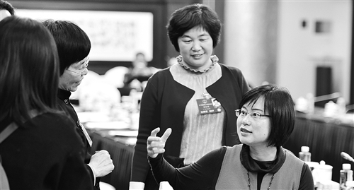 3月11日,人大廣東代表團(tuán)在駐地舉行分組會議。全國人大代表龍芳(右一)、李淑明(右二)與同團(tuán)代表在討論“一帶一路”戰(zhàn)略對廣東企業(yè)“走出去”產(chǎn)生的影響。本報記者 李景錄攝