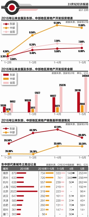 21世紀(jì)經(jīng)濟(jì)研究院比照數(shù)據(jù)發(fā)現(xiàn),僅開(kāi)發(fā)投資數(shù)據(jù)的月度波動(dòng)并不足見(jiàn)房地產(chǎn)市場(chǎng)的冷熱狀況,因?yàn)檫@受不同地區(qū)的供地節(jié)奏影響較大。比如在5月,一些中部熱點(diǎn)城市的土地供應(yīng)明顯減少,造成了投資失速的狀況。