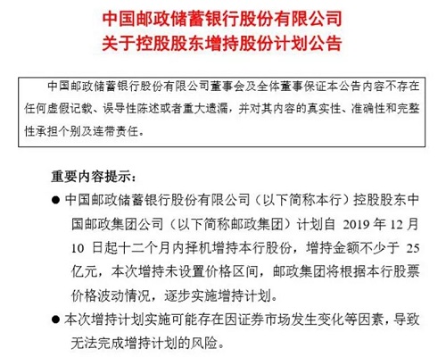 備受市場關(guān)注的是,同日,郵儲銀行還發(fā)布了《關(guān)于控股股東增持股份計劃公告》。公告稱,控股股東中國郵政集團(tuán)公司(下稱郵政集團(tuán))計劃自2019年12月10日起12個月內(nèi)擇機(jī)增持該行A股股份,增持金額不少于25億元。這體現(xiàn)了控股股東對郵儲銀行投資價值的高度認(rèn)可,也將為證券市場的穩(wěn)定運(yùn)行創(chuàng)造良好環(huán)境,彰顯“國家隊(duì)”擔(dān)當(dāng)。