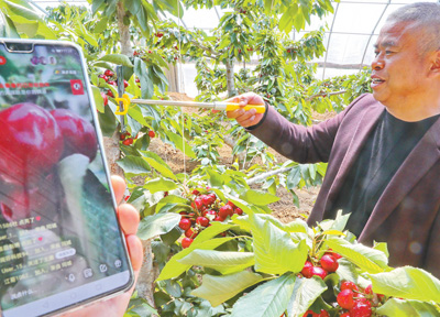4月9日,秦皇島市海港區(qū)海陽鎮(zhèn)鯉泮莊村的祺和大櫻桃種植基地內(nèi),村民蘇士明使用網(wǎng)絡(luò)平臺(tái)直播推銷大櫻桃。 人民視覺