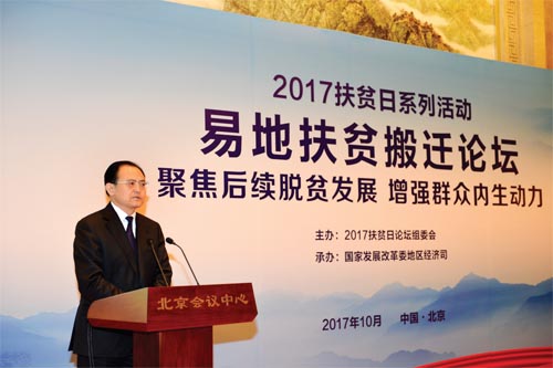本次論壇以“聚焦后續(xù)脫貧發(fā)展,增強(qiáng)群眾內(nèi)生動(dòng)力”為主題,是2017 年扶貧日系列活動(dòng)之一。來自國家發(fā)改委、人力資源社會(huì)保障部、國土資源部、交通運(yùn)輸部、水利部、農(nóng)業(yè)部、商務(wù)部、中國人民銀行、國家林業(yè)局、國家旅游局、銀監(jiān)會(huì)、國務(wù)院扶貧辦、全國工商聯(lián)、國家開發(fā)銀行、中國農(nóng)業(yè)發(fā)展銀行等部門和單位有關(guān)司局負(fù)責(zé)同志,全國22 個(gè)有易地扶貧搬遷任務(wù)的省份發(fā)展改革委負(fù)責(zé)同志以及部分省、市、縣從事易地扶貧搬遷工作的干部群眾,帶動(dòng)搬遷群眾脫貧致富的部分龍頭企業(yè)代表,共約100 人參加了論壇。