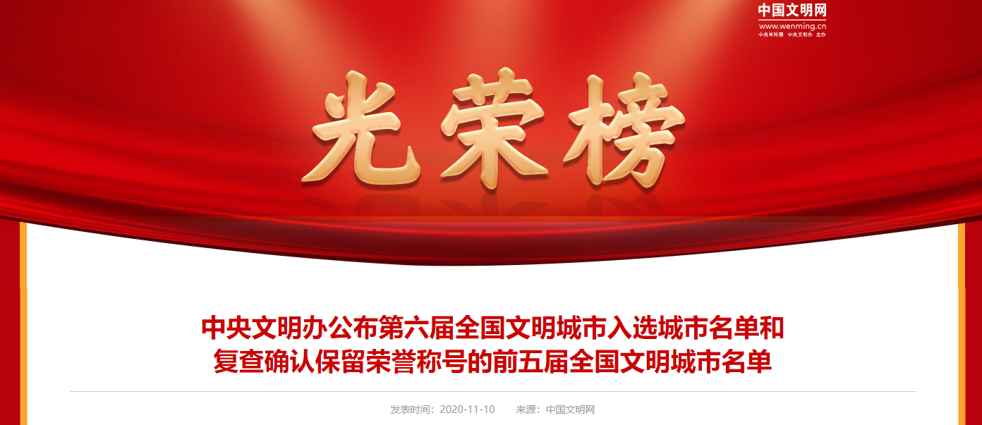 2020年8月以來(lái),中央文明辦按照城市自主申報(bào)、省級(jí)擇優(yōu)推薦、中央部委審核、媒體集中公示、組織綜合測(cè)評(píng)、確定入選城市等評(píng)選辦法和程序,嚴(yán)謹(jǐn)規(guī)范組織第六屆全國(guó)文明城市評(píng)選工作,嚴(yán)格依據(jù)參評(píng)城市2018、2019、2020年三年測(cè)評(píng)總成績(jī)排名,提出第六屆全國(guó)文明城市入選城市名單,報(bào)中央文明委領(lǐng)導(dǎo)同志批準(zhǔn)。同時(shí),中央文明辦按照城市自查、省級(jí)審核、中央把關(guān)、組織測(cè)評(píng)等復(fù)查辦法和程序,認(rèn)真做好前五屆全國(guó)文明城市復(fù)查工作,嚴(yán)格依據(jù)全國(guó)文明城市復(fù)查測(cè)評(píng)成績(jī),提出繼續(xù)保留榮譽(yù)稱號(hào)的全國(guó)文明城市名單,報(bào)中央文明委領(lǐng)導(dǎo)同志批準(zhǔn)?,F(xiàn)將第六屆全國(guó)文明城市入選城市名單和復(fù)查確認(rèn)保留榮譽(yù)稱號(hào)的前五屆全國(guó)文明城市名單公布如下。