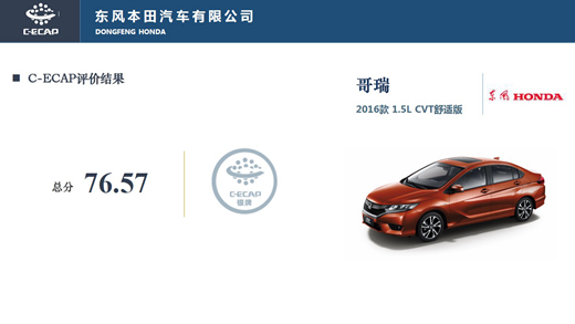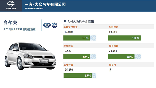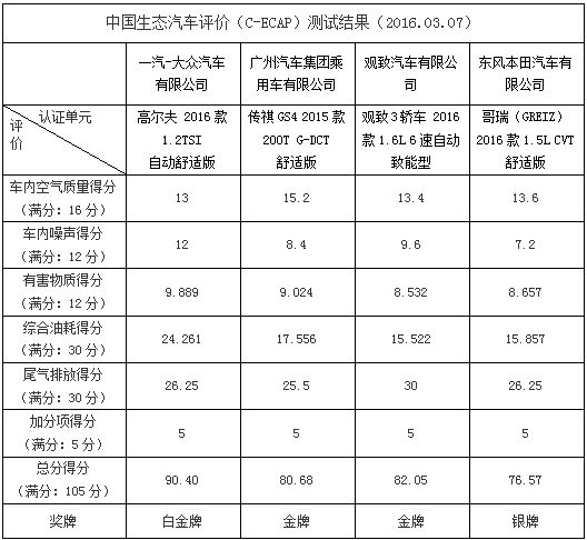 人民網(wǎng)天津3月9日電(鄂智超)日前,中國(guó)生態(tài)汽車評(píng)價(jià)(C-ECAP)新一批測(cè)試結(jié)果公布。本次共公布了四款車型,分別為一汽-大眾高爾夫 2016款 1.2TSI自動(dòng)舒適版(90.40分)、廣汽傳祺GS4 2015款 200T G-DCT舒適版(80.68分)、觀致3轎車 2016款1.6L 6速自動(dòng)致能型(82.05分)、東風(fēng)本田哥瑞 2016款1.5L CVT舒適版(76.57分)。其中一汽-大眾高爾夫車型獲得白金牌,廣汽傳祺GS4與觀致3轎車獲得金牌,東風(fēng)本田哥瑞獲銀牌。