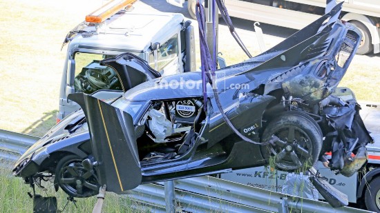 科尼塞克早上發(fā)布消息稱(chēng)One:1打算在紐北刷新最快圈速紀(jì)錄。知情人表示,刷圈過(guò)程中,車(chē)輛在高速駛?cè)階denauer Forst彎時(shí)發(fā)生失控,車(chē)身撞跨賽道左側(cè)的護(hù)欄,進(jìn)而飛入草地,事故令One:1車(chē)身?yè)p毀嚴(yán)重,前保險(xiǎn)杠折斷、擋風(fēng)玻璃破碎,尾部受損。