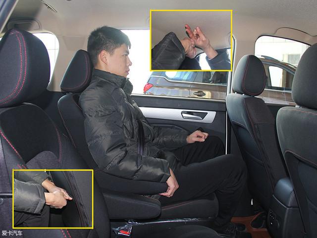 第二排為兩個(gè)獨(dú)立座椅,座椅填充和前排保持一致,乘坐感受同樣舒適,頭枕高度可調(diào)。前排座椅位置保持不變,同一位模特坐進(jìn)第二排,頭部空間剩余一拳三指,腿部空間剩余一拳兩指。