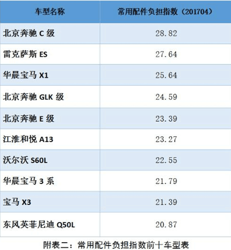 常用配件負(fù)擔(dān)指數(shù)方面,在汽車零整比系數(shù)基礎(chǔ)上,挖掘事故車維修數(shù)據(jù),選取配件損失率大于 1%的常用配件進(jìn)行研究,導(dǎo)入計算公式核算各車型的常用配件負(fù)擔(dān)指數(shù)。在樣本車型中最高的車型為北京奔馳 C級,常用配件負(fù)擔(dān)指數(shù)為 28.82;最低的車型為哈弗 H6,常用配件負(fù)擔(dān)指數(shù)為 9.32。