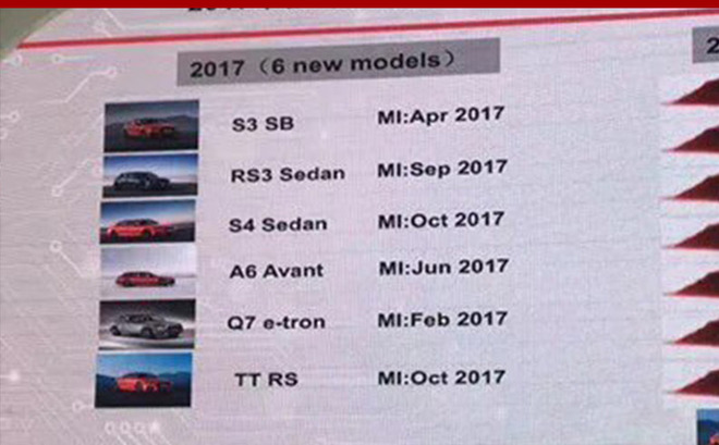 從曝光的產品規(guī)劃來看,2017年奧迪有6款新車上市。到目前為止,奧迪Q7 e-tron和A6 Avant已經(jīng)按照規(guī)劃正式上市。原本計劃在4月上市的S3 Sportback有望三季度正式投入市場,奧迪RS 3 Sedan在9月上市,而奧迪S4 Sedan與TT RS將于今年10月上市。