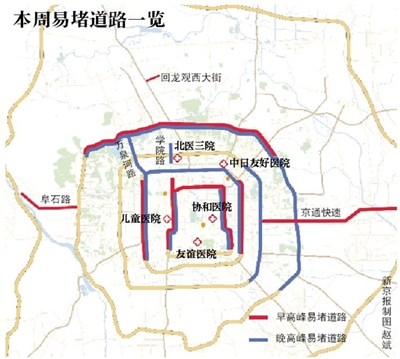 隨著近期氣溫下降,感冒等季節(jié)性疾病高發(fā),各大醫(yī)院就診人數增多,朝陽安貞地區(qū)、西城月壇地區(qū)、東城王府井地區(qū)的交通壓力較大,預計工作日上午時段,兒童醫(yī)院、協和醫(yī)院、中日友好醫(yī)院、友誼醫(yī)院、北醫(yī)三院等醫(yī)院就診人數增多,周邊交通壓力較大。