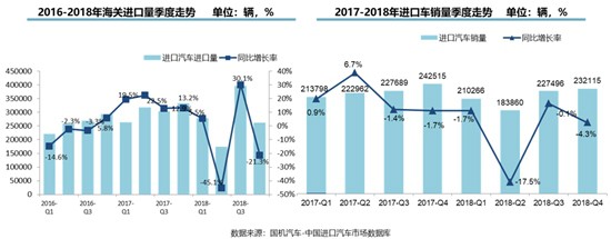 聚焦平行進口車市場,2018年,平行進口汽車銷量出現(xiàn)了5年來的首次下滑,且市場波動明顯。2018年,平行進口車銷量占進口車總銷量的12.6%,達13.97萬輛,同比下滑18.6%,下滑幅度遠超進口車市場整體表現(xiàn)。而中美貿易摩擦、國內對車輛環(huán)保要求更為嚴格等因素,也導致平行進口車的銷量走低。各個季度的表現(xiàn)則更能體現(xiàn)該市場的巨幅波動,其中,平行進口車一季度銷量同比增長4.4%,表現(xiàn)穩(wěn)定;二季度卻出現(xiàn)50.2%的大幅下滑;三季度報復性回漲33.1%,四季度依舊疲軟;最終,平行進口車在2018年全年的銷量呈現(xiàn)大幅下滑的局面。